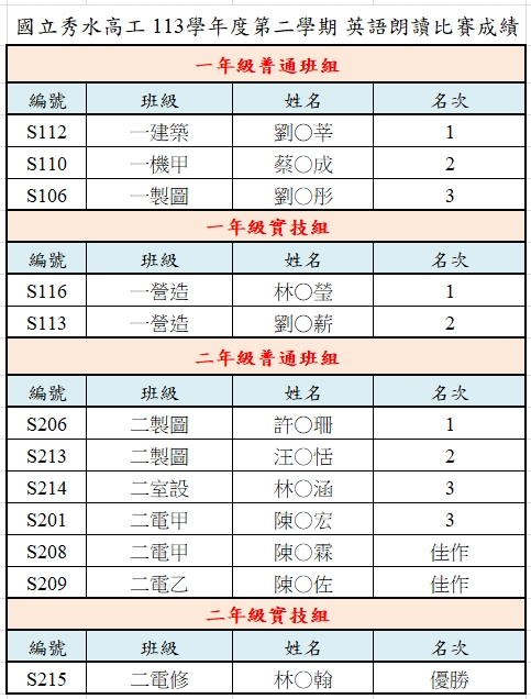 113學年度第2學期 英語朗讀比賽成績